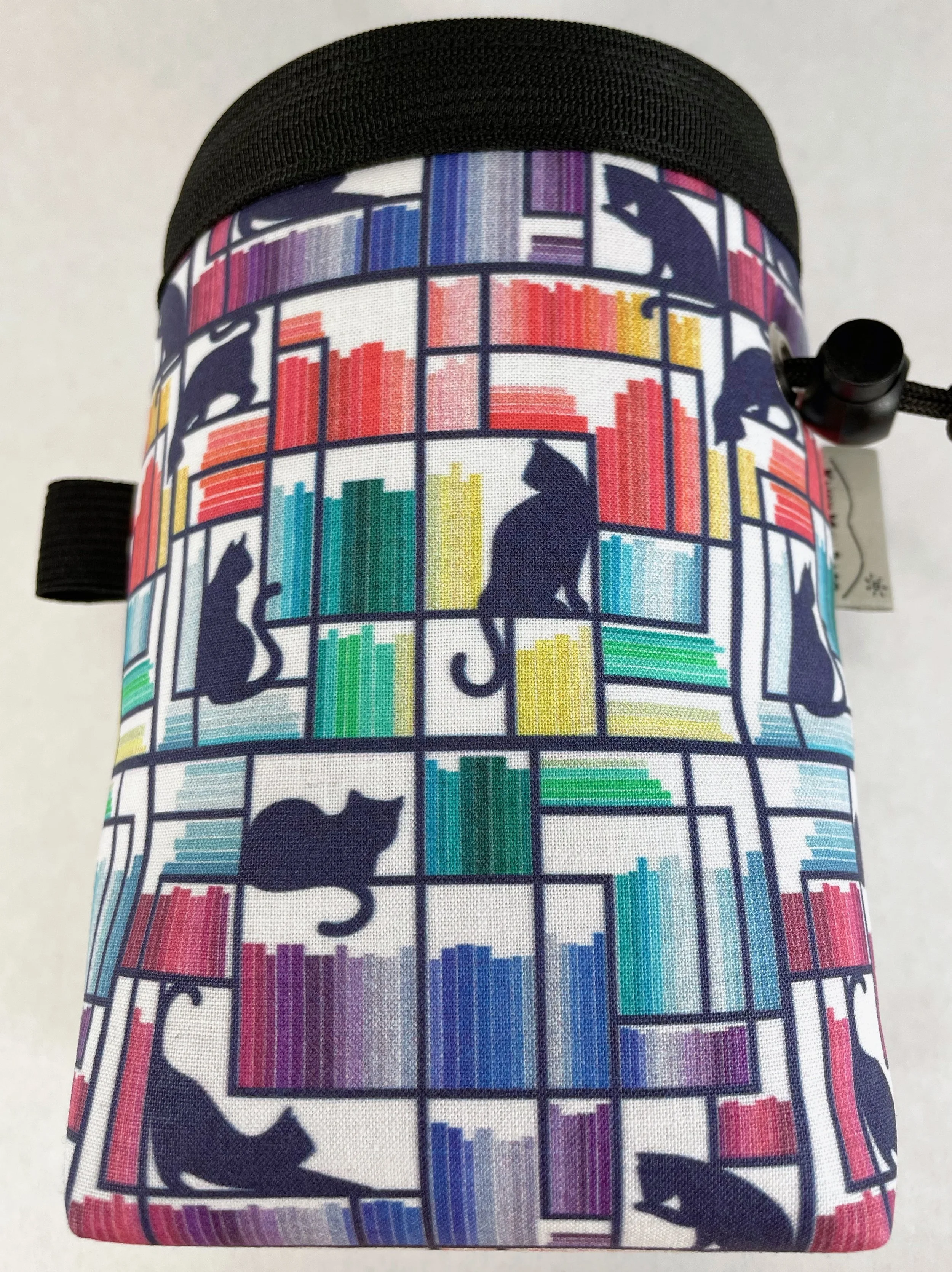 Cats in a rainbow library adorn this drawstring chalk bag, designed for rock climbing but also great for holding chalk for gymnastics, weightlifting, CrossFit, disc golf, or for whatever else you need chalk handy. This stylish pouch is also useful for holding animal treats for training or as a cute, closable hip bag to hold anything from items you would keep in a purse to art supplies.
